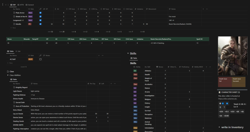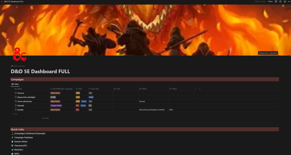 5e Notion template I made so that you could keep your character and campaign in your notion system for when you play. Keep track of your campaigns and record your adventures planning for the demise of your players. Multiple templates for NPCs, monsters you encounter, Access to a custom session database view on your character sheet or under your DM template.