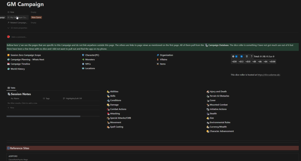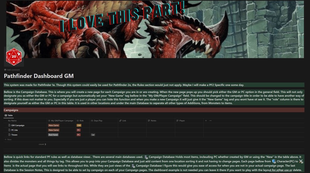 Pathfinder Notion template I made so that you could keep your character and campaign in your notion system for when you play. Keep track of your campaigns and record your adventures planning for the demise of your players. Multiple templates for NPCs, monsters you encounter, Access to a custom session database view on your character sheet or under your GM template.